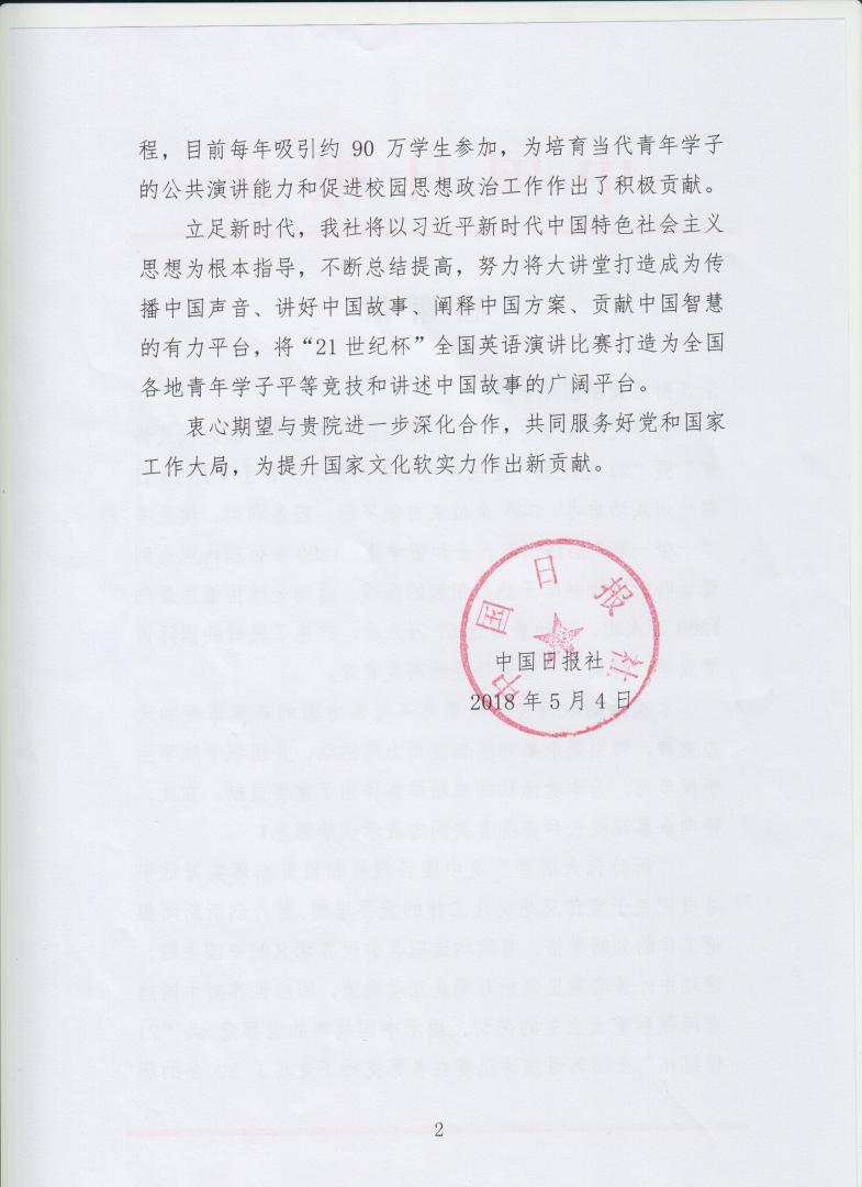 近日,《中国日报》社专程致函我院,对我院师生积极参加主题为“命运共同体 世界新图景”、由该报主办的“新时代大讲堂”暨“21世纪杯”全国英语演讲比赛总决赛颁奖典礼表示感谢。