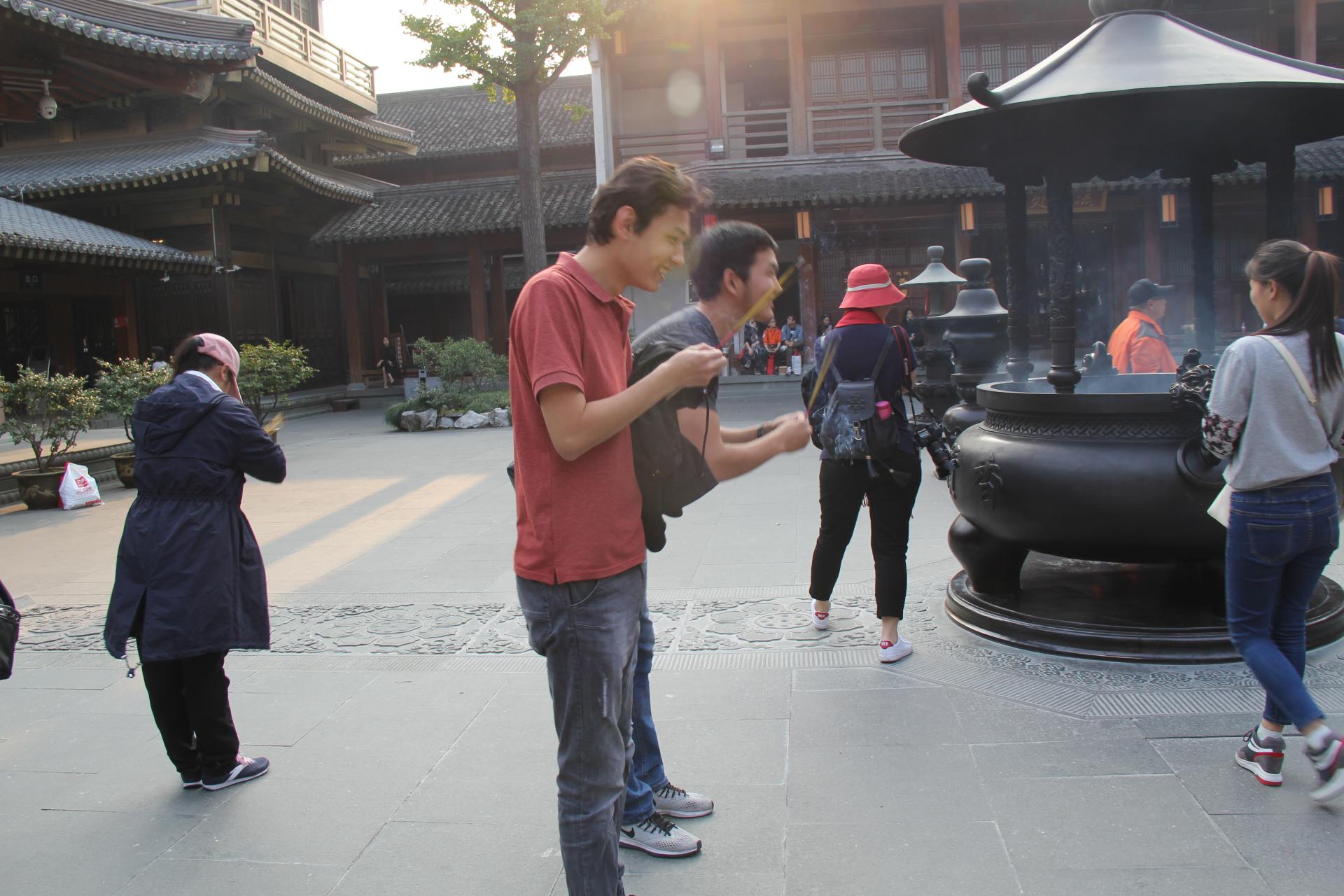 “香积祈福”是婚典的重要环节,由香积寺监院法师主持祈福仪式,保佑新人们一生吉祥,白头偕老,幸福美满。留学生们也跟随新人来到香积寺,秉持诚挚之心,点燃佛香,潜心三拜,祈福祝愿。