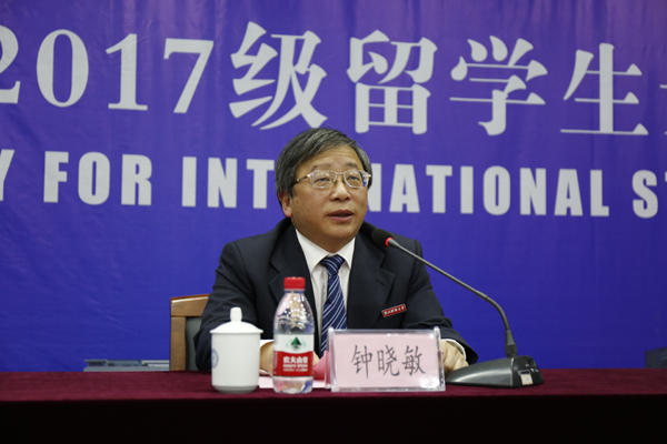 钟晓敏发表了热情洋溢的讲话。他勉励留学生适应新环境,谋求新进步,做融通世界的友好使者。他对留学生提出了几点希望,希望他们尽快适应新环境,过好生活关、语言关和学习关;充分利用学校良好的学习资源,勤奋学习,提升自身综合素质。他鼓励留学生在课余时间多走走、多看看,体会中国文化的特有魅力,感受中国经济社会发展的巨大变化。钟晓敏还引用了习近平总书记的讲话,指出“中国将高举和平、发展、合作、共赢的旗帜,推动建设相互尊重、公平正义、合作共赢的新型国际关系,希望各国人民同心协力,构建人类命运共同体,建设持久和平、普遍安全、共同繁荣、开放包容、清洁美丽的世界。”他鼓励留学生为中国和世界各国人民的交流与合作,发挥桥梁纽带作用,为增进世界各国人民的友谊,为世界的和平与发展做出贡献。