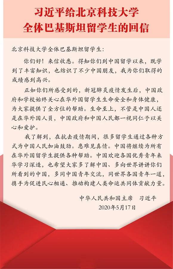 5月17日,国家主席习近平给北京科技大学全体巴基斯坦留学生回信,对各国优秀青年来华学习深造表示欢迎,鼓励他们多同中国青年交流,同世界各国青年一道,携手为促进民心相通、推动构建人类命运共同体贡献力量。