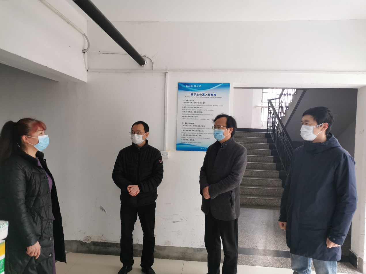 3月2日,校党委副书记黄建新来我院留学生宿舍巡查指导。黄建新副书记来到紫元宿舍区,与在宿舍值班的辅导员老师进行了详细交谈,对党员老师在疫情防控特殊时期坚持在一线给予了充分肯定,强调要发扬党员先锋模范作用,打赢校园防疫战。黄建新还了解了留学生生活与心理状况,强调要做到严控与疏导双管齐下,确保留守校园留学生安全。