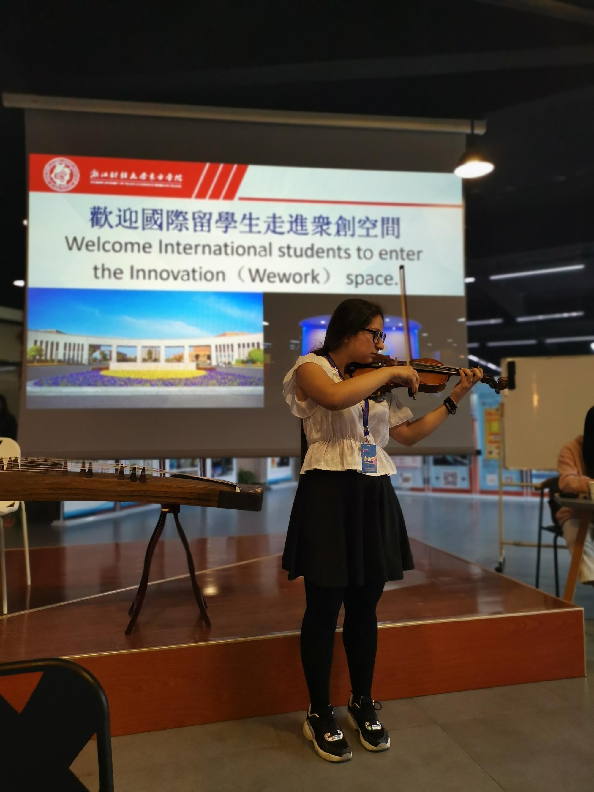 中外学生首先在众创咖啡厅举行了联欢活动,中国学生带来的古筝名曲《渔舟唱晚》,空灵婉转;哈萨克斯坦留学生ZIYADA带来的小提琴独奏《天空之城》,更是引起了大家的共鸣;随后,中国学生一曲《突然想起你》,赢得了阵阵掌声;接着,卢旺达学生朱丽用中文朗诵了一首《你是人间的四月天》,语言流利、情感饱满,讴歌了美好的春天;然后,印度学生ISHITA也用印地语朗诵了一首古老的印度诗歌;最后,中外学生一起共跳“小苹果”、“海草舞”,将活动的氛围推向了高潮。