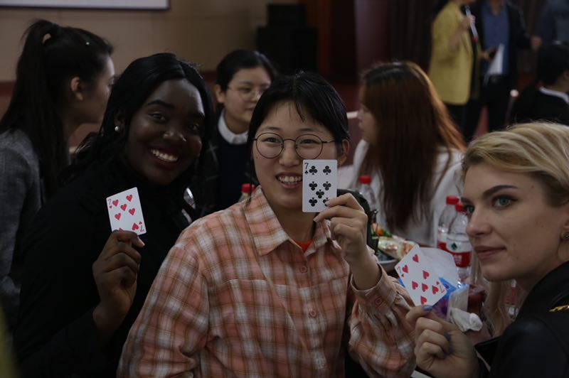 留学生们首先来到外国语分院,受到了外国语分院领导和学生的热烈欢迎,并在外语自主与文化体验中心409教室进行了一场别开生面的联谊活动。活动伊始,中外学生以抽扑克牌的形式,分小组、找搭档、结对子。随后的“你猜我画”小游戏,不仅考验了搭档们的配合默契度,也进一步激发了其他学生们的活动参与度,大家积极主动地纷纷举手,想要一展画功。