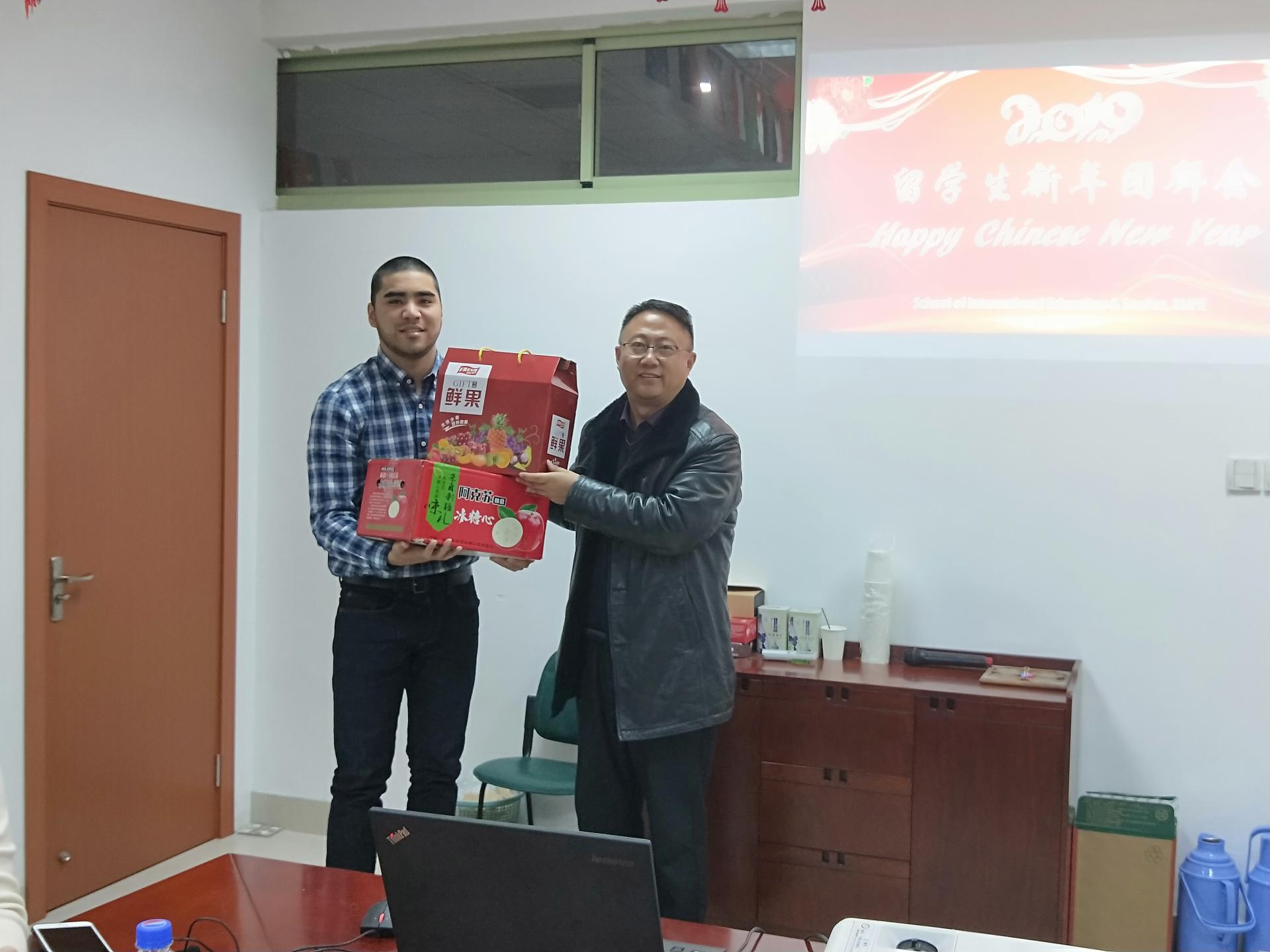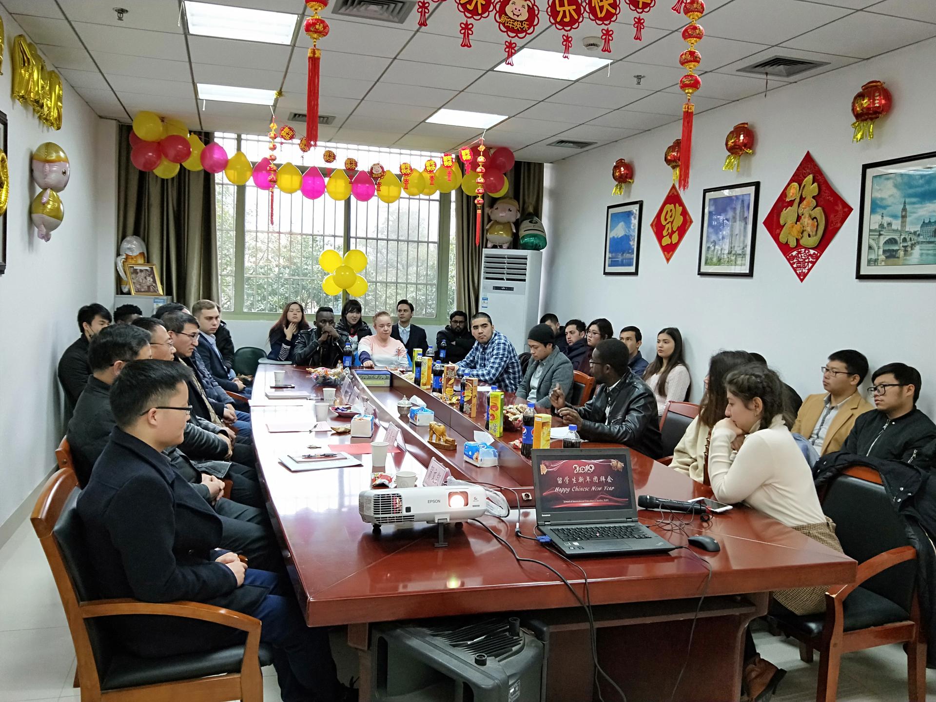 师生在会议室济济一堂,2019年留学生新春团拜会在此举行。李占荣副校长出席团拜会,慰问寒假留校的留学生,并送上了新春的祝福,衷心祝愿他们在学校度过一个难忘的中国春节。
