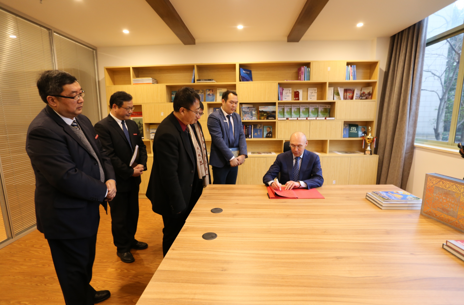 哈萨克斯坦经济社会研究中心。哈萨克斯坦共和国驻沪总领事克拉巴叶夫·佐齐汉, 哈萨克斯坦教育科学部国际计划中心别克主任等8位哈国贵宾陪同参观。