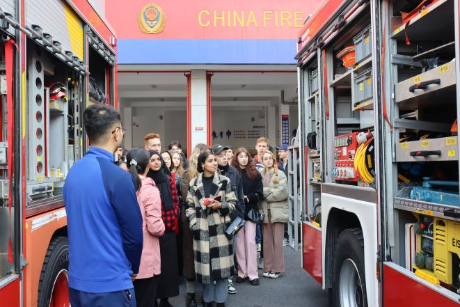 首先特勤消防救援大队宣教员带领国际学生们近距离地观察消防车,详细讲解了各种消防车辆的名称、功能,并介绍了消防车上的高压水枪、水带、灭火器、救生圈等消防装备的用途和使用方法,让同学们大开眼界。