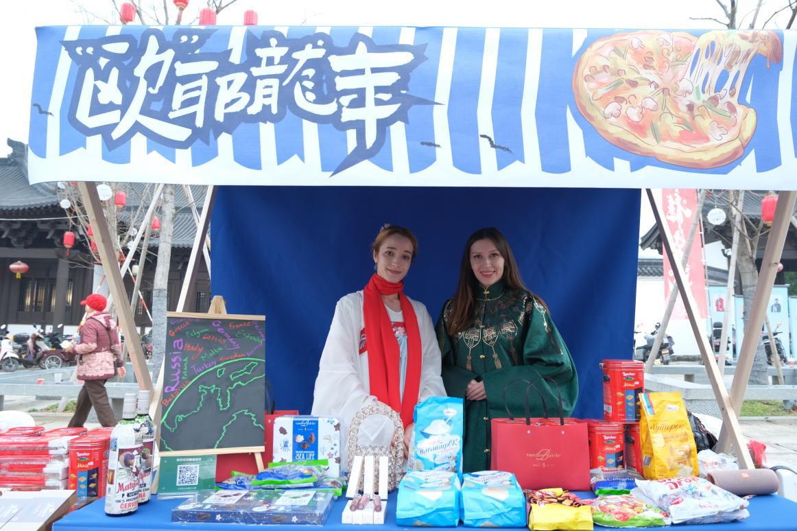 本次活动分为严州古城参观及中国民俗体验两部分进行。1月18日适逢中国传统节日——腊八节,留学生们跟随向导脚步,参观了美丽的古城。随后,“鱼跃龙门起大锅”“严州宋韵赶大集”“卧虎藏龙开大营”等诸多特色民俗活动轮番登场,让留学生们体验了一场大型非遗民俗盛宴。在古城瓮城里,五口大锅升腾起年味的热气,大家一起动手烹饪蒸煮,并为现场市民送上暖心的腊八粥。龙山书院广场上的宋韵集市也热闹非凡,写春联,打年糕,剪窗花……留学生们当起了“非遗传承人”,近距离感受浙西特色非遗与建德人特有的“宋韵浪漫”。市集还专门开辟了国际特色产品区,留学生们学做摊主,纷纷为各自家乡的特产吆喝叫卖。