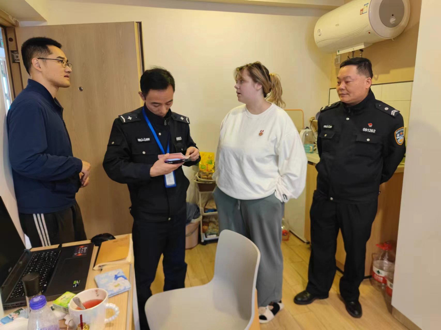 副院长黄志雄、留学生辅导员汪博林、辖区派出民警及社区工作人员组成的校外住宿检查工作组,对校外住宿留学生进行了实地走访。
