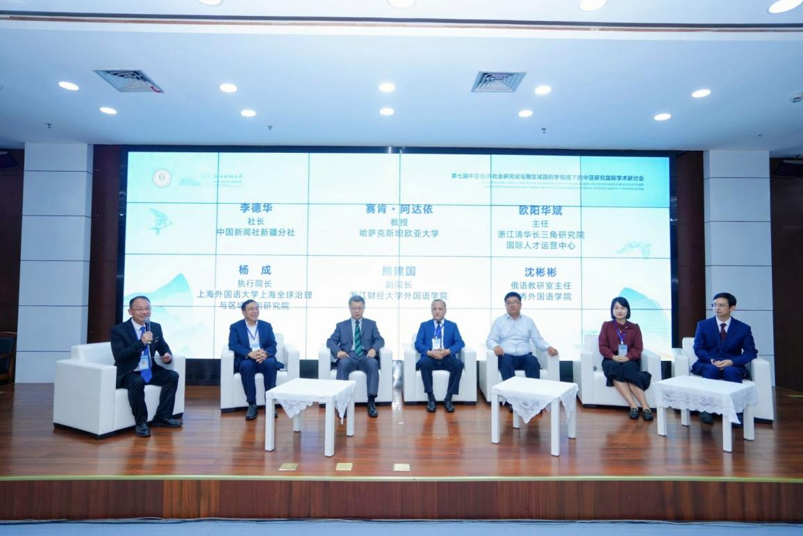 圆桌论坛环节,中国新闻社新疆分社社长李德华、上海外国语大学上海全球治理研究区域国别研究院执行院长杨成教授、哈萨克斯坦欧亚国立大学的赛肯·阿达依教授、清华长三角研究院人事国际人才管理主任欧阳华斌、浙江越秀外国语学院沈彬彬和韩国漫画