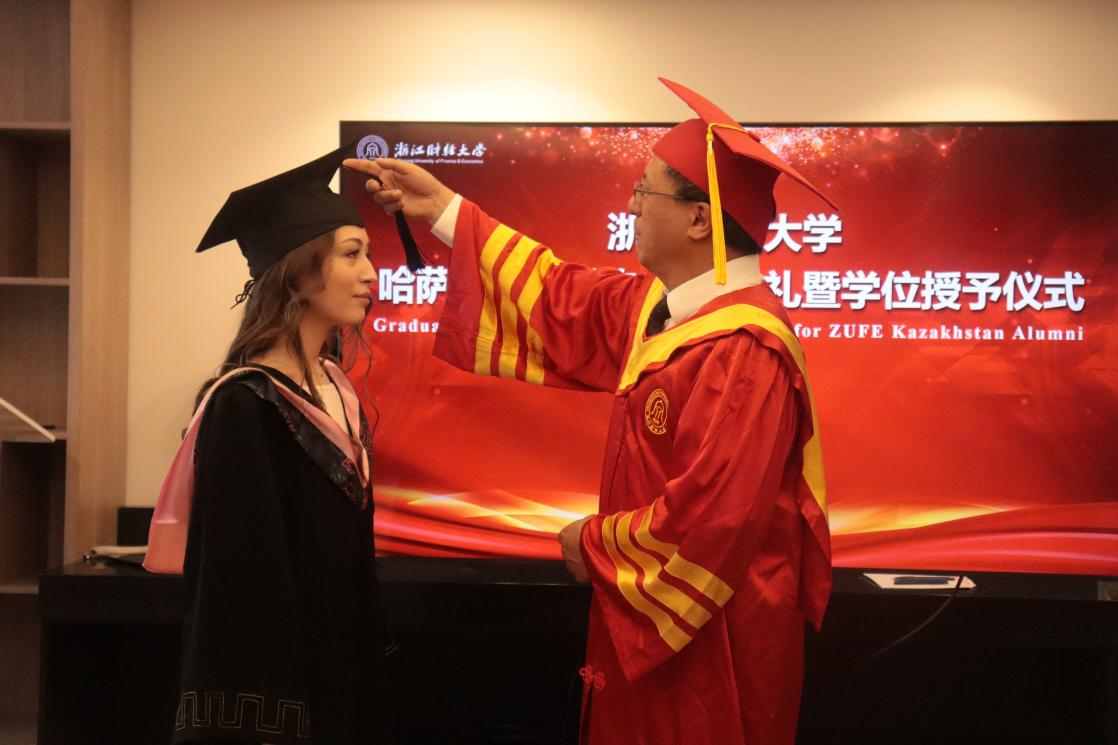 党委副书记,副校长(主持行政日常工作)魏江,飞越万里,来到阿拉木图,就是为了给留学生校友一个神圣的仪式感。魏江向哈萨克斯坦校友介绍了学校发展取得的成绩,他饱含深情地说,“母校一直惦记着你们,你们是中哈双边的大使,要抓住中哈友好合作的历史机遇,将个人的成长与母校发展、中哈合作紧密结合起来,争做浙财大杰出校友。”他诚挚邀请校友们回母校参加五十周年校庆,并给24位未参加过拨穗仪式的校友一一拨穗、合影,不时地亲手给学生整理学位帽。这一刻,没有文化障碍,没有国籍差别,只有师生情谊。