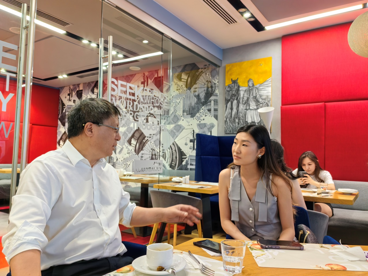 中午,老师与校友共进午餐,共叙旧情。23届毕业生孙琴一直珍藏着自己参加“梦行浙江”留学生才艺展演的走秀视频,专门拿出来跟老师们分享。杭州的包子,老师的叮咛,钱塘的潮水,学涯湖的白鹅……,一幕一幕,让他们梦回杭州,梦回浙财大。