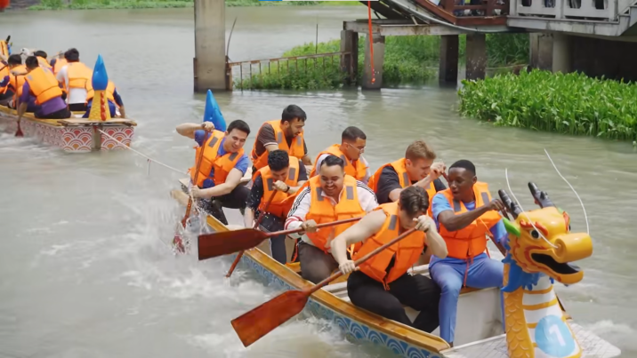 龙舟队”,和冠军队伍进行了一场友谊赛,共同体验中国的端午习俗。来自哈萨克斯坦的丹尼兴奋地表示:“划龙舟太酷了!我已经爱上这项运动了,明年想参加正式的比赛。”