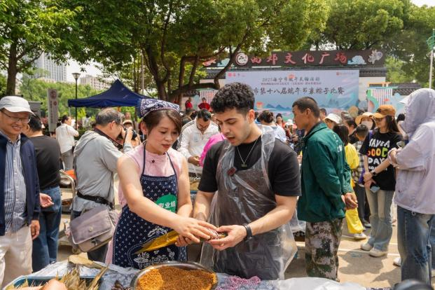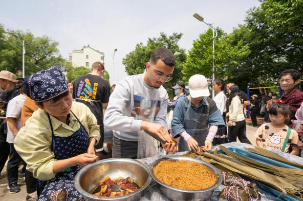 在民俗体验区,留学生们在当地居民的指导下学习包制粽子。从粽叶的折叠到糯米的填充,每一个步骤都让国际学生亚当感到新奇:“我觉得包粽子太难了,但是阿姨说我学得很快,我很期待成品!”