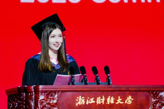 管理学院2021级电子商务专业本科生安娜(俄罗斯籍),作为毕业国际生代表上台发言。从俄罗斯来到校园,从学习汉语到古筝书画、从“挑战杯”鏖战到创业实践,安娜深情告白:“浙财教会我把真实的中国故事讲给世界听!”让“一带一路”沿线闪耀浙财之光。