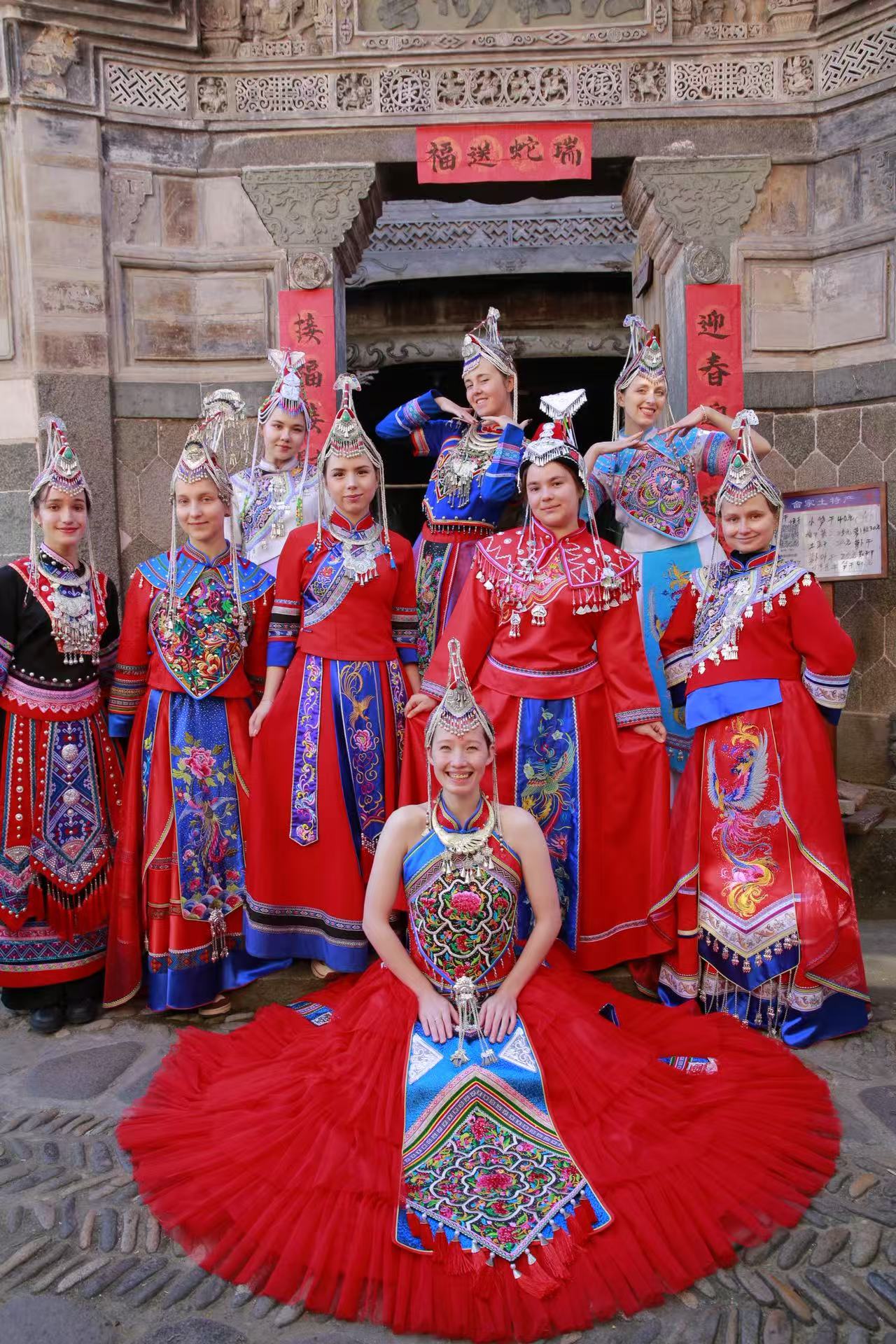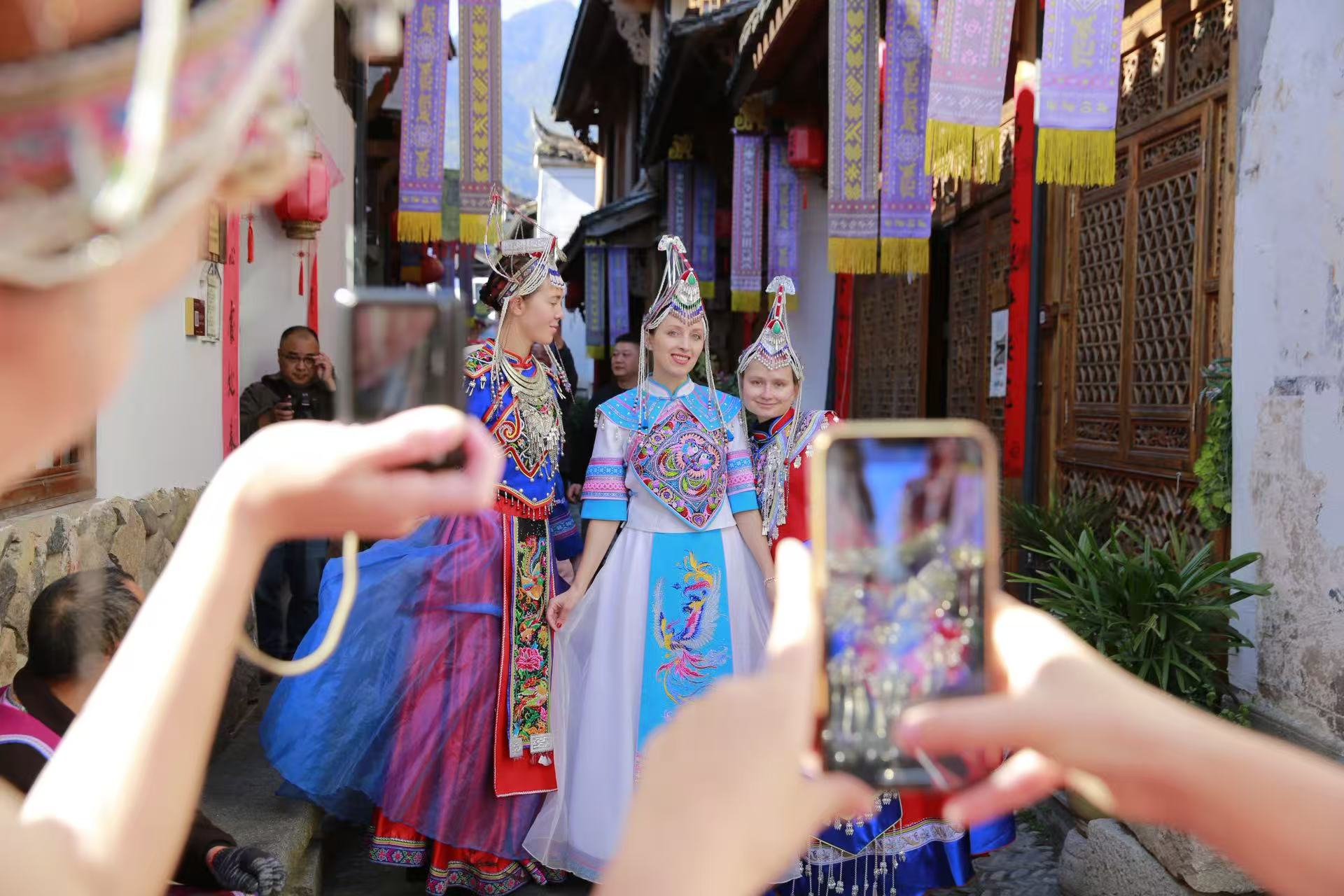 此次活动的压轴环节是试穿精美的畲族传统服饰。留学生们对色彩鲜艳、绣工精巧的凤凰装表现出极大的兴趣。在畲族居民的帮助下,大家纷纷换上畲装,戴上精美的头饰,瞬间化身为“畲家儿女”。她们身着盛装,漫步在古色古香的街巷中,用相机定格下这跨越文化的美丽瞬间。