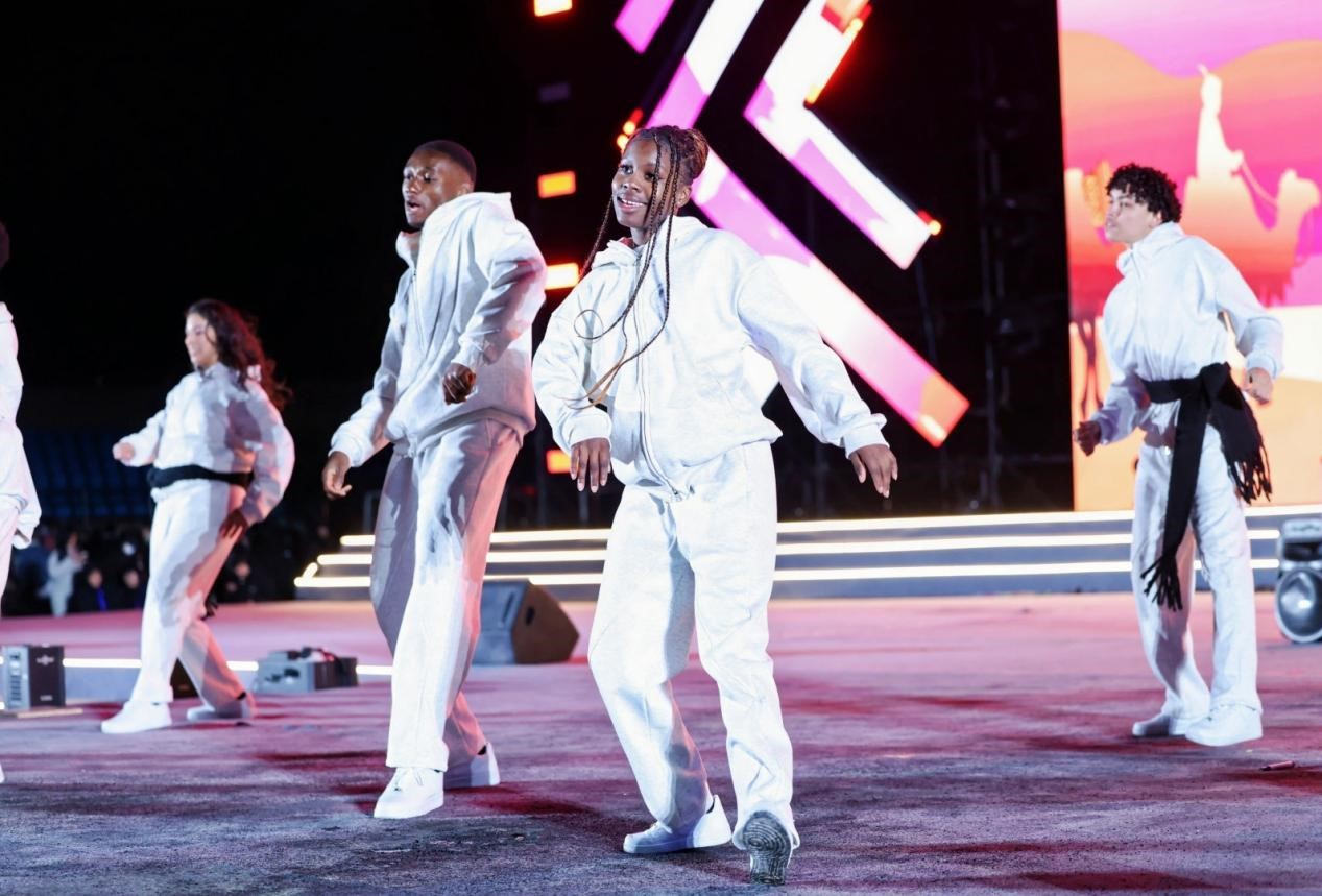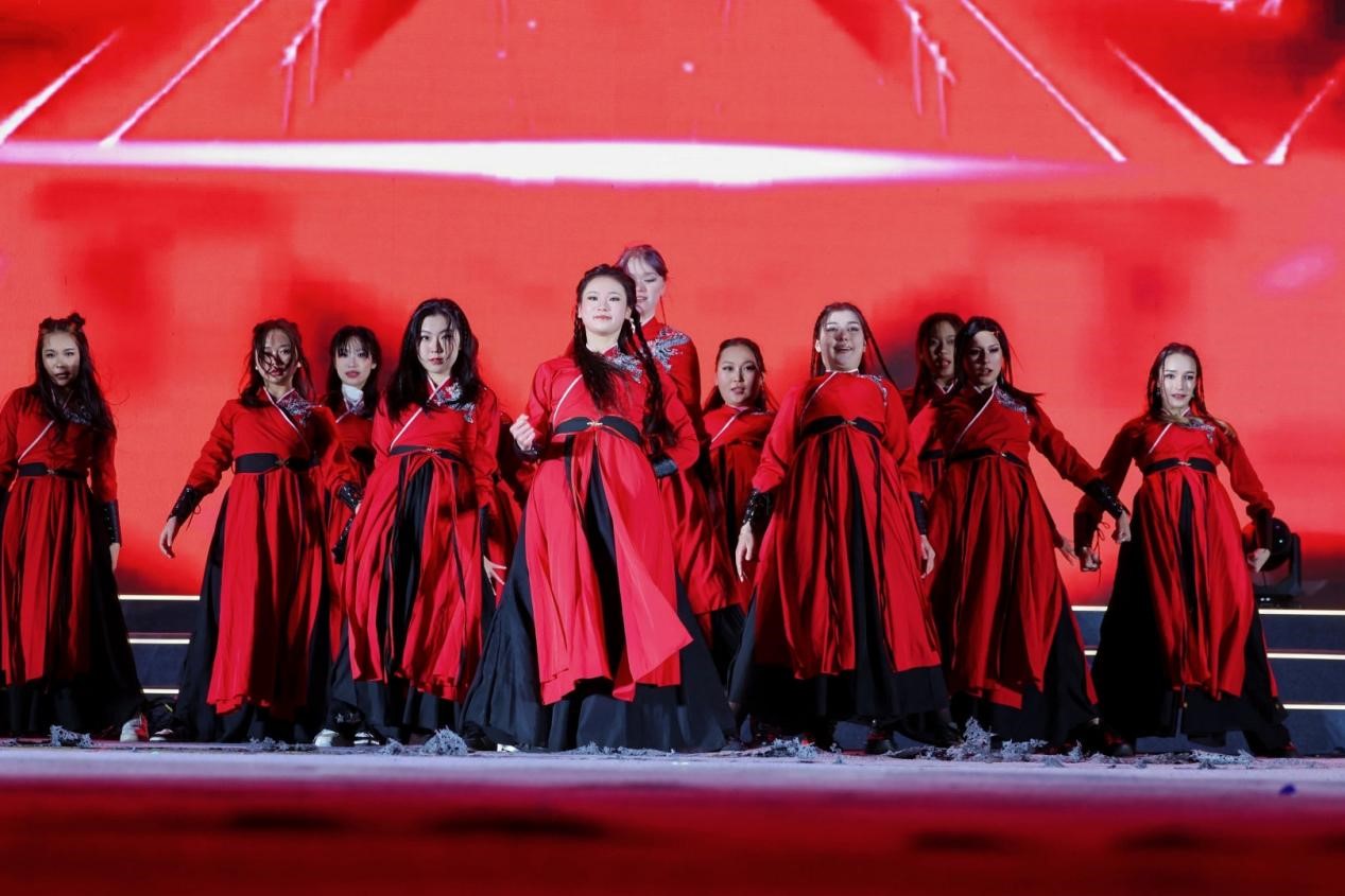 留学生同学们积极参与演出,展现各国文化特色。活力四射的街舞《Paint the Town》以动感节奏点燃全场热情;舞蹈《The Greatest Show》则以绚烂编排诠释青春激情。中外学生联袂献唱的合唱《Lovely》《多远都要在一起》,用中英双语串联起情感共鸣,传递跨越山海的情谊。此外,来自非洲的同学们带来传统舞蹈《TozoBina》,奔放的节奏与独具风情的舞步,让师生沉浸于异域文化的魅力之中。