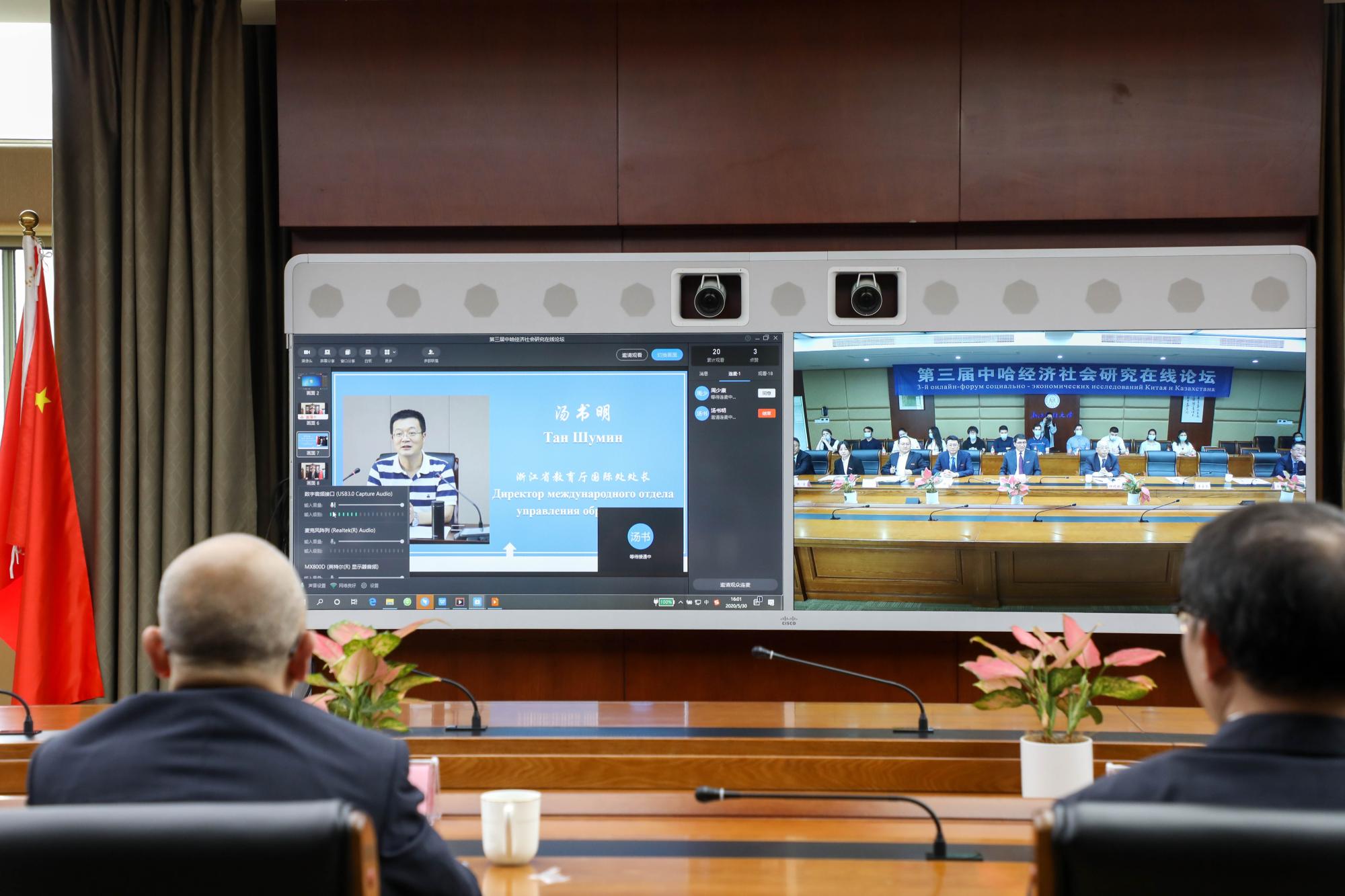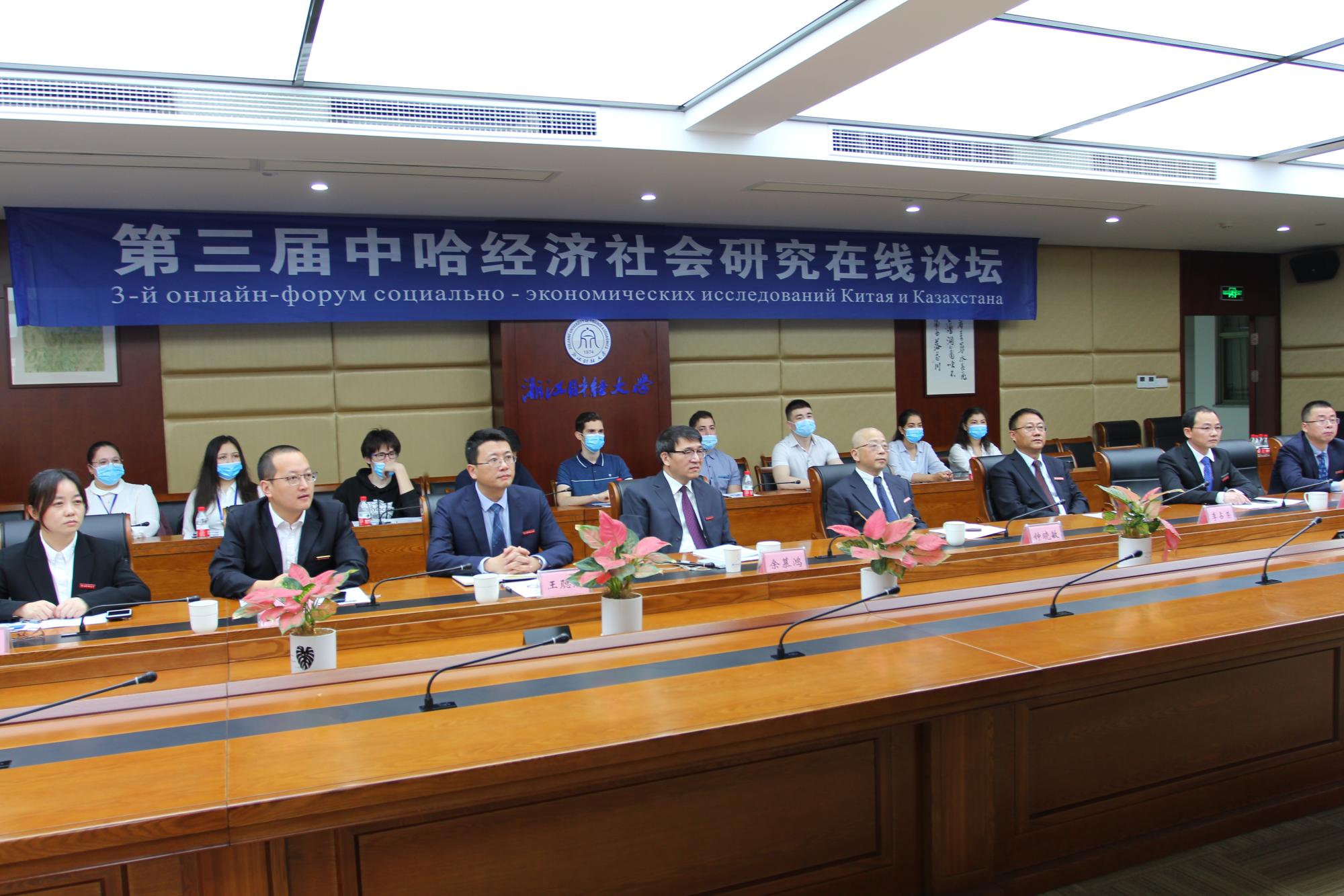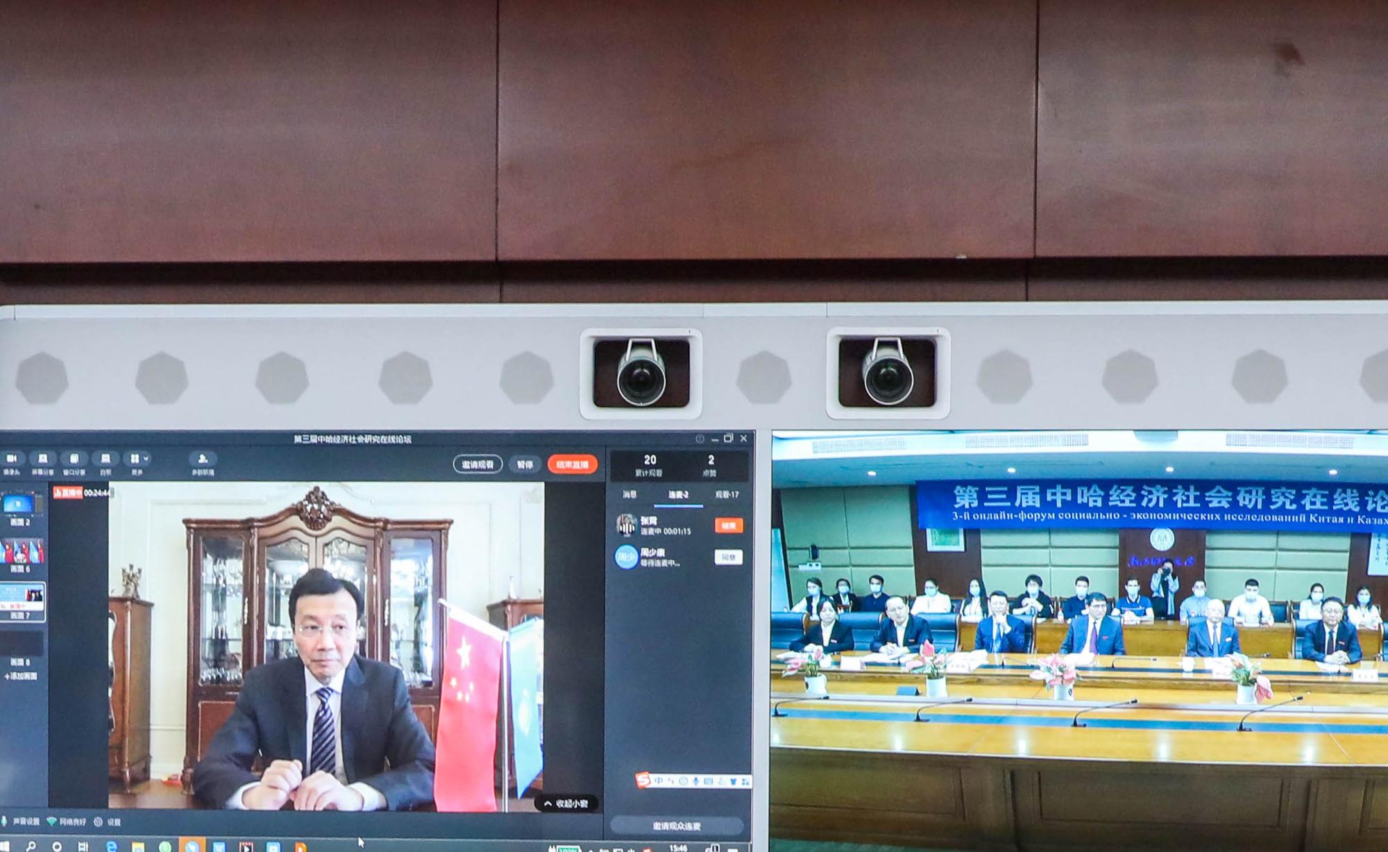 来自中国驻哈萨克斯坦大使馆、浙江省教育厅国际交流合作处、哈萨克斯坦阿斯塔纳国际科学院、哈萨克斯坦国立欧亚大学、中国社会科学院、兰州大学、西北大学、新疆财经大学等知名高校的专家学者以及阿斯塔纳国际金融中心、哈萨克斯坦YourChina公司、上海政法学院上海合作组织国际司法合作基地、中国民族翻译局、中央财大、上海财大、北京外国语大学等10余所大学以及浙江省政府外办、浙江国贸云商公司、浙江人民出版社、浙江交工集团国际公司、新疆中亚研究中心的嘉宾和企业负责人近1000人齐聚钉钉会议直播平台,大家围绕论坛主题展开了热烈而深入的研讨。