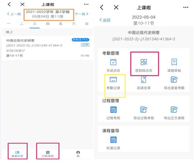 第二步:进入“上课啦”系统后,教师可查阅每周课表,在课堂上可通过手动点名或签到码等方式进行点名,并可进行过程考核管理。