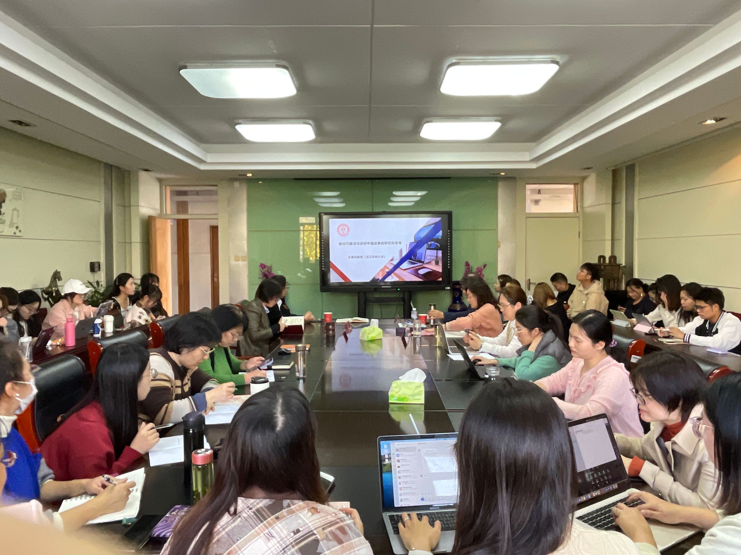 在互动环节中,参会师生们就翻译软件的使用及其对外传播的影响进行了热烈讨论。余教授鼓励学生在使用翻译工具时要保持批判性思维,并注重提升母语水平,以便更好地讲好中国故事。此次讲座不仅为师生们带来了深刻的学术见解,也激发了大家对新时代国际传播的思考和热情。